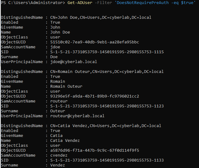 Une commande PowerShell à lancer sur le contrôleur de domaine permet de lister les comptes dont la pré-authentification n'est pas requise :