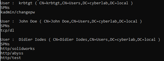 La plupart des SPN sont liés à des comptes machines qui ont des mots de passe aléatoires très long, inexploitable pour une attaque par brute force. A l'inverse, les SPN liés à des comptes utilisateurs sont vulnérables et exploitables dans le domaine.