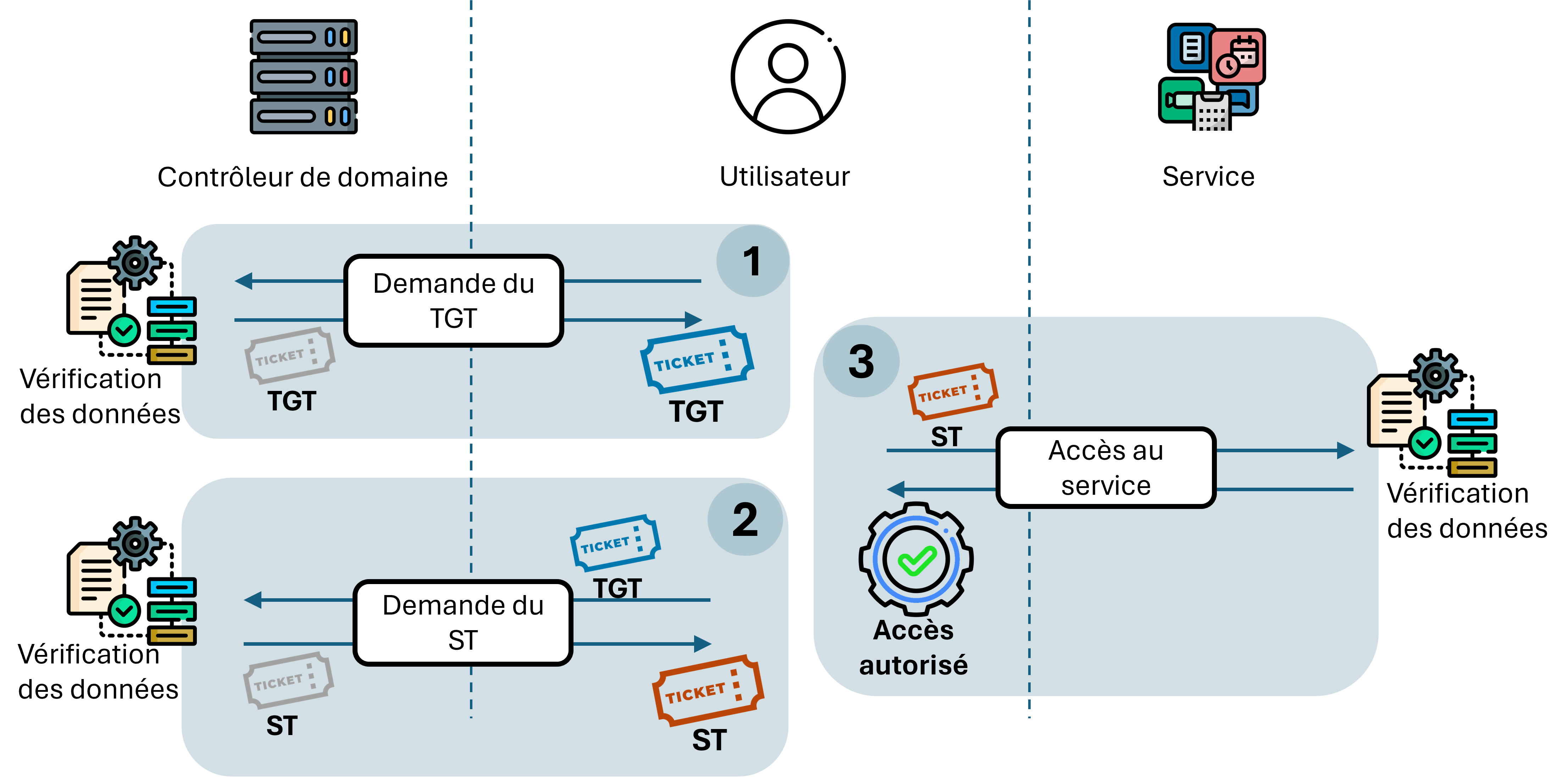 L'accès à un service requiert un échange de tickets entre le contrôleur de domaine, l'utilisateur et le service demandé. L'authentification s'effectue en trois phases, décrites ci-dessous.