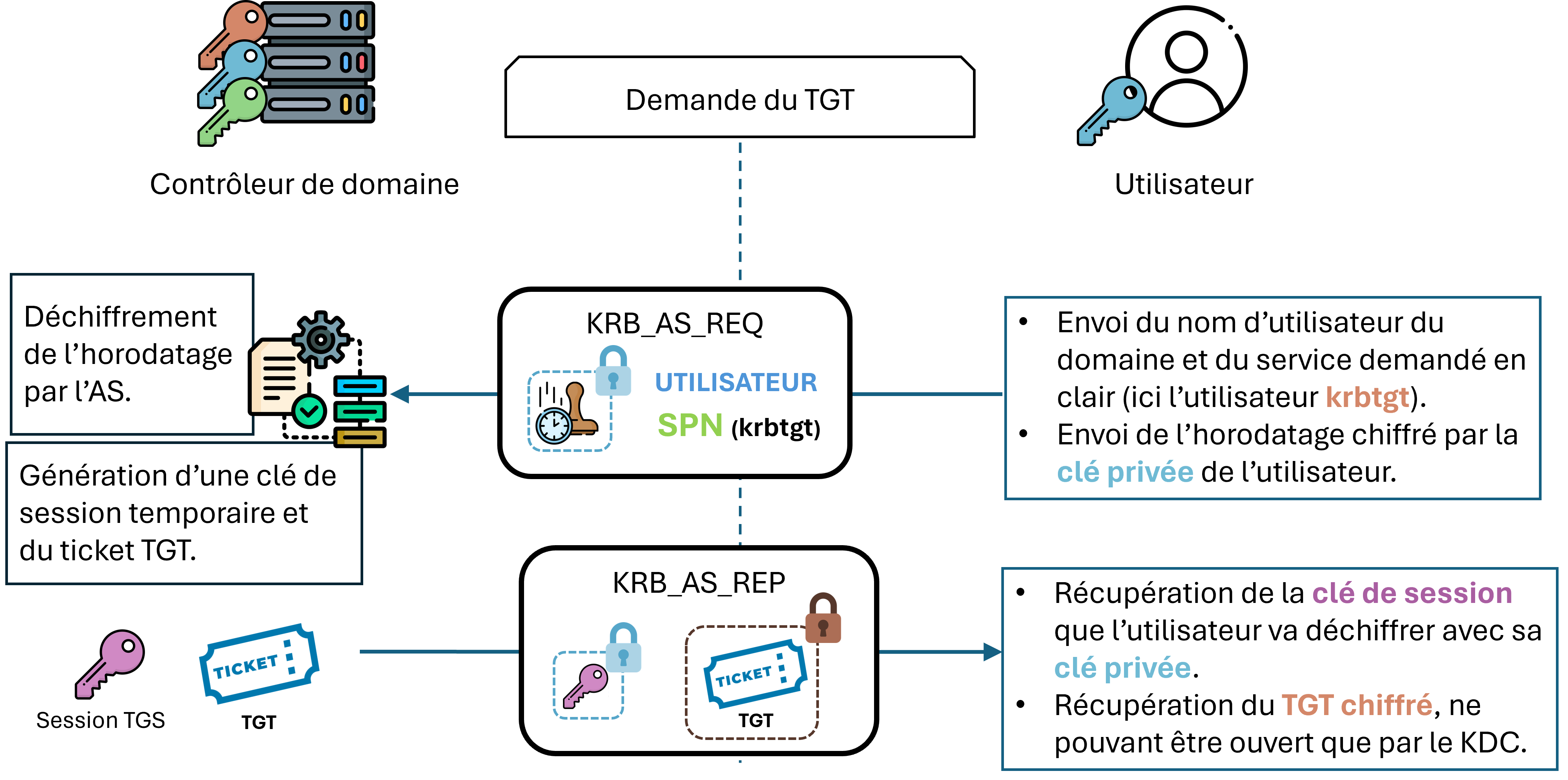 L'utilisateur demande un ticket TGT (Ticket Granting Ticket) en s'authentifiant sur un service du contrôleur de domaine.