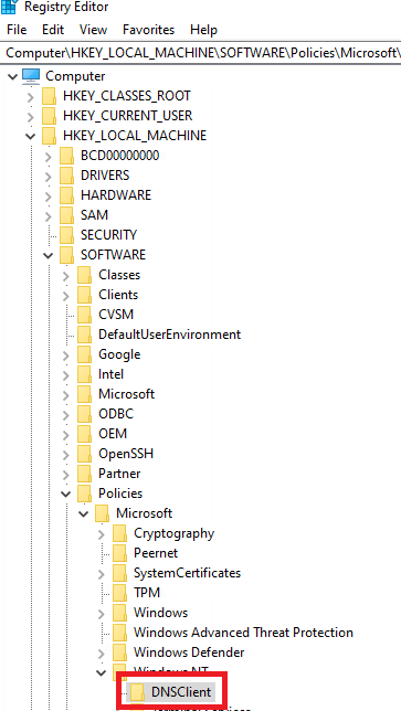 Pour cela rendez-vous dans l'éditeur de registre et rechercher la clé HKEY_LOCAL_MACHINE\SOFTWARE\Policies\Microsoft\Windows NT\DNSClient