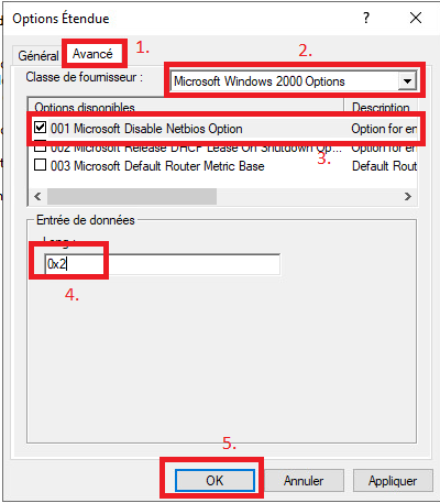 Sélectionnez l'onglet "Avancé" et modifiez la "Classe de fournisseur" en "Microsoft Windows 2000 options". Cochez ensuite la case "001 Microsoft Disable Netbios Option" dans la zone "Options disponibles" et définissez la "Saisie de données" sur 0x2. Cliquez sur "OK". Les nouveaux paramètres seront pris en compte lors du renouvellement des adresses par les clients.