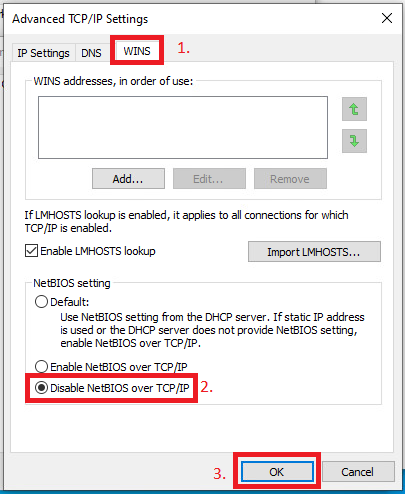 Accédez à la section "WINS" (Windows Internet Name Service). Cochez l'option "Désactiver NetBIOS sur TCP/IP".