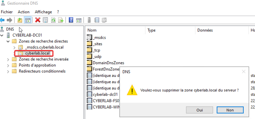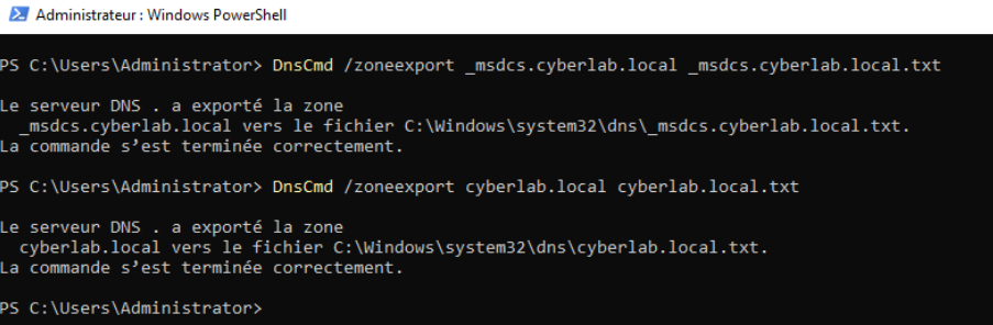 Exporter les zones DNS présentes sur le serveur. Ici "_msdcs.cyberlab.local" et "cyber.local" sont les nom de la zone DNS;