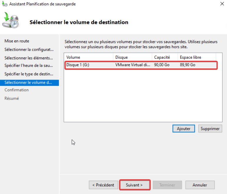 Cliquer sur Suivant puis sélectionner le disque où stocker les sauvegardes (ajouter le volume s'il n'apparaît pas dans la liste);