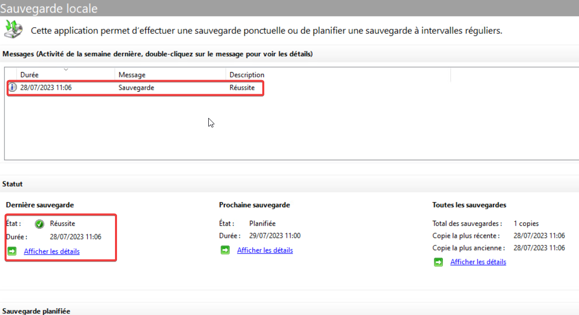 Une fois la sauvegarde terminée, un message s’affiche dans l’interface graphique :
