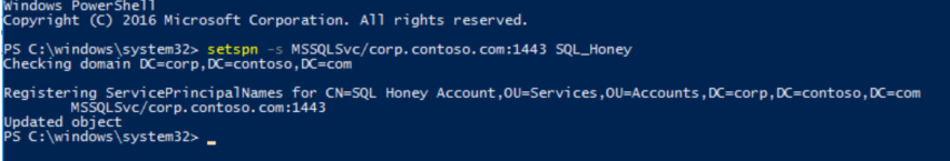 setspn -s MSSQLSvc/corp.contoso.com:1443 SQL_Honey