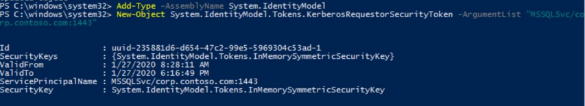 Add-Type -AssemblyName System.IdentityModelNew-Object System.IdentityModel.Tokens.KerberosRequestorSecurityToken -ArgumentList "MSSQLSvc/corp.contoso.com:1443"