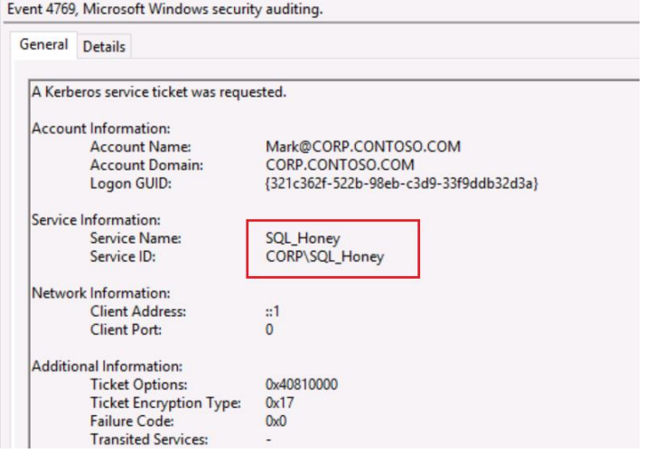Maintenant, lorsque quelqu'un demande un ticket de service à partir de ce compte SQL_Honey, un journal d'évènements apparaîtra dans les journaux de sécurité. Étant donné que ce faux compte de service ne correspond à rien, une alerte devrait être déclenchée.