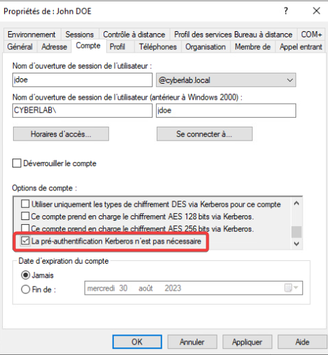 - Définir l'attribut msDS-SupportedEncryptionTypes sur 0x18 (décimal 24), afin que seules les méthodes de chiffrement AES128 et AES256 soient activées;