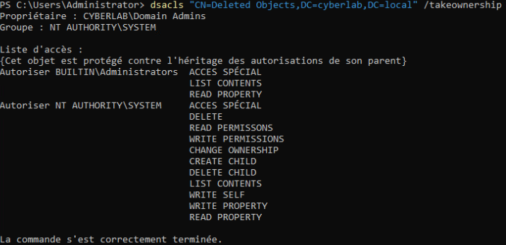 dsacls "CN=Deleted Objects,DC=corp,DC=contoso,DC=com" /takeownership