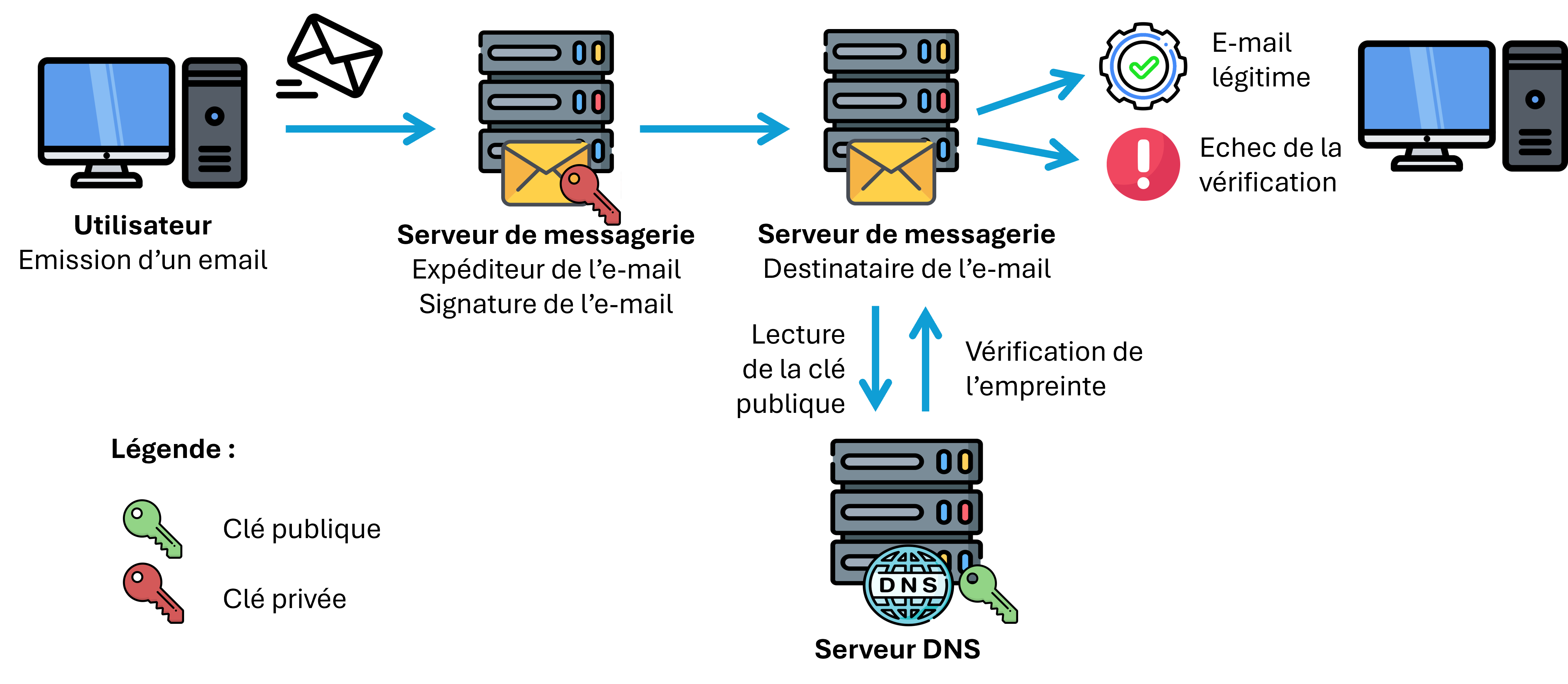 Ce protocole assure la signature des échanges par un échange de clés, publique et privée. La clé privée est stockée dans le serveur expéditeur tandis que la clé publique est renseignée via l'enregistrement DNS. La signature de l'expéditeur est ajoutée à l'en-tête des e-mails, c'est le serveur d'envoi qui signe avec sa clé privée. Le serveur de destination interroge l'enregistrement DNS public pour obtenir la clé publique et ainsi vérifier l'empreinte.