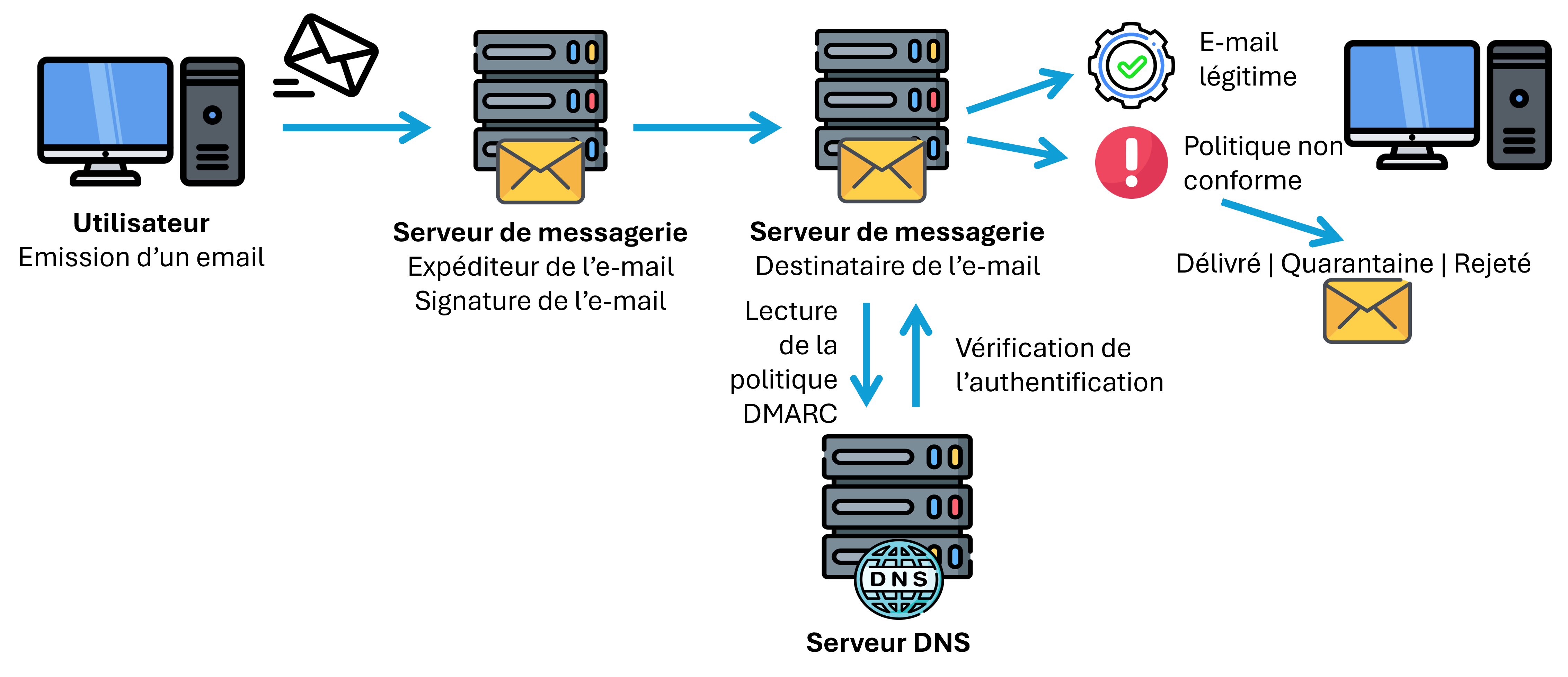 Si le serveur émetteur est autorisé, l'e-mail est considéré comme authentique et est accepté. À l'inverse, le serveur de réception peut rejeter l'e-mail ou le marquer comme suspect le cas échéant.