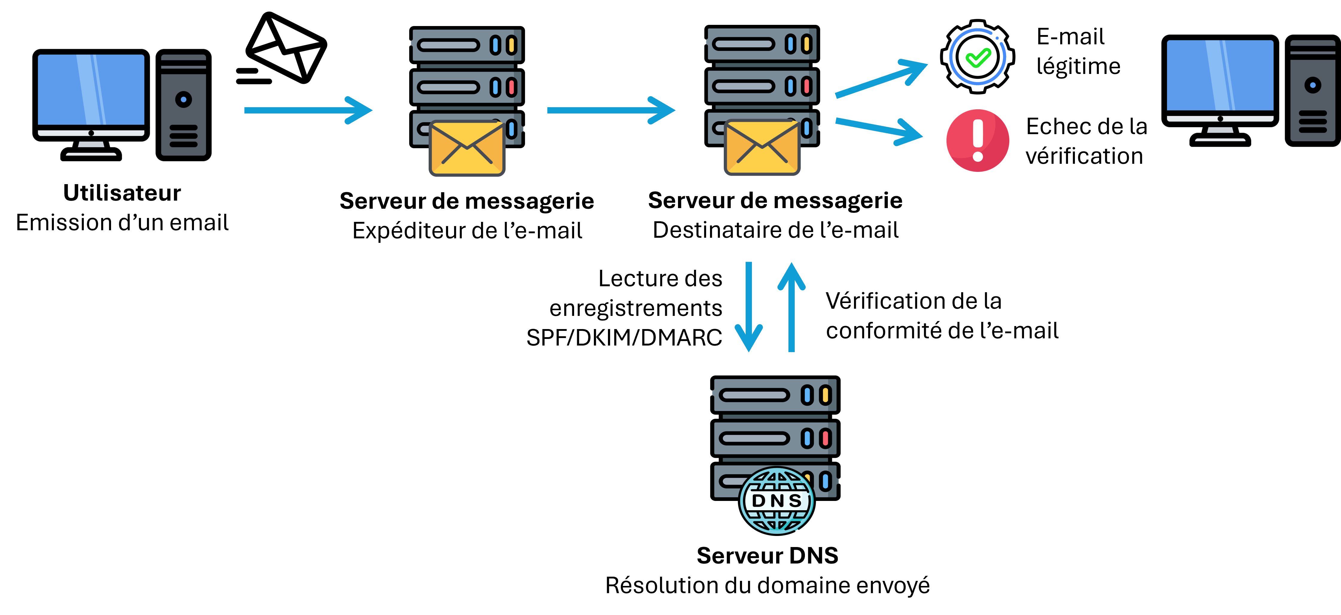 De ce fait, il est important de configurer correctement le SPF pour authentifier l'émetteur d'un e-mail. En effet, le serveur de messagerie de destination va vérifier le nom de domaine de l'expéditeur à partir de l'en-tête de l'e-mail. Il va ensuite émettre une requête DNS pour récupérer le contenu de l'enregistrement DNS de type TXT) pour le domaine en question. Cette action permet d'obtenir la liste des serveurs de messagerie légitimes afin de comparer cette liste avec le serveur de messagerie à l'origine de l'e-mail.
