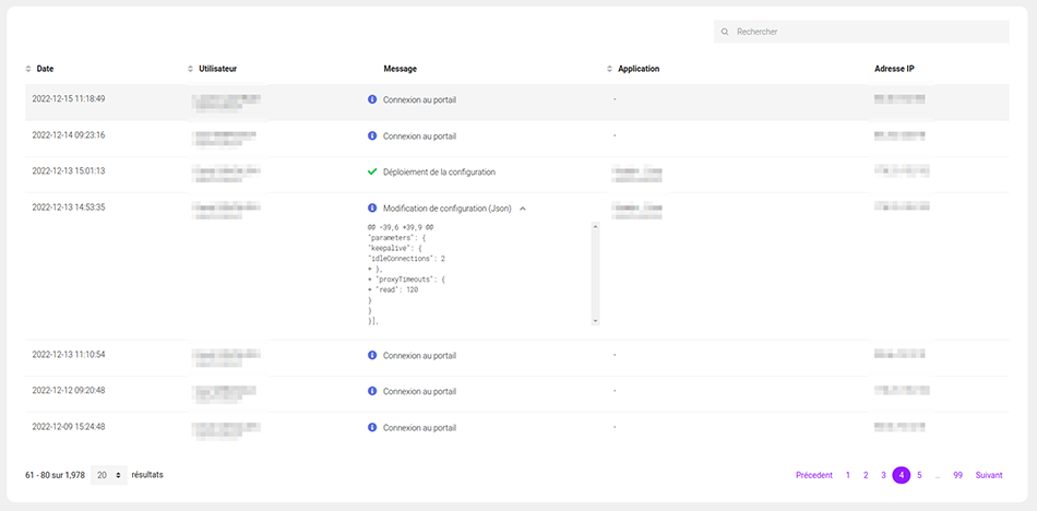 L'Historique des actions vous permet d'avoir la liste exhaustive des modifications ou opérations effectuées sur vos applications. Vous pouvez également y consulter la liste des connexions au portail de gestion.