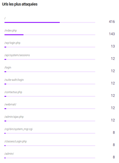 Le tableau des URL's les plus attaquées vous permet de comprendre quelles sont les parties de votre application qui sont le plus souvent mises à l'épreuve. Cette liste vous permet de renforcer la sécurité en ciblant ces zones précises pour une protection renforcée, et la mise en place de correctifs spécifiques le cas échéant.