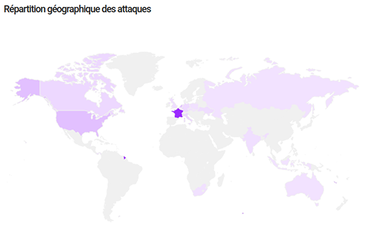 Chaque attaque détectée par Visiativ Cyber WAF est géolocalisée selon son pays d'origine. Chaque pays de la carte est représenté avec une intensité visuelle variable en fonction du volume d'attaques correspondant. Cette représentation vous donne une vue globale des zones géographiques les plus sensibles vous permettant de mieux comprendre les tendances et les points d'origine des attaques, facilitant ainsi la prise de mesures de sécurité ciblées.