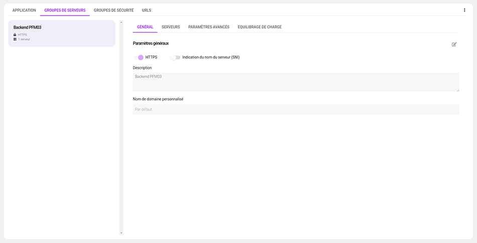 L'onglet Groupe de serveurs regroupe les paramétrages liés à votre infrastructure d'hébergement (serveurs, paramètres de proxy et d'équilibrage de charge, etc.). Chaque groupe peut être associé à une zone fonctionnelle de votre application.