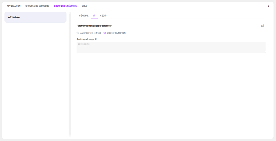 L'onglet Groupes de sécurité regroupe les paramétrages liés à la sécurité proactive de votre application (restrictions IP et GeoIP, en-têtes HTTP, etc.). Chaque groupe peut être associé à une zone fonctionnelle de votre application.
