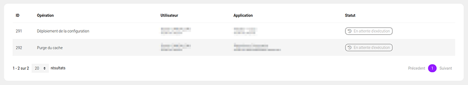 Pour chaque opération vous pouvez retrouver l'identifiant unique de la tâche, le type d'opération, l'utilisateur ayant initié la tâche, l'application concernée ainsi que le statut d'exécution.